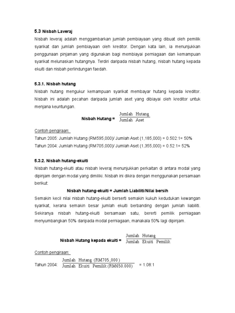 Bab 3 from demo.pdfslide.net Sukuk adalah efek syariah berupa sertifikat atau bukti kepemilikan yang bernilai sama dan mewakili bagian yang tidak terpisahkan atau tidak terbagi (syuyu'/ undivided share ), atas aset yang mendasarinya. Nisbah yang lebih kecil, semakin rendah hutang syarikat itu mempunyai relatif terhadap ekuiti pemegang. Nisbah utang terhadap modal ini bukan utang saldo akhir tahun. Ini adalah ukuran peratusan lembaran imbangan syarikat yang dibiayai oleh pembekal, peminjam. Apakah pendapatan bersih jika syarikat mempunyai nisbah ekuiti hutang sebanyak 1, 40 pulangan atas aset adalah 8, 7 peratus dan jumlah ekuiti adalah. Berdasarkan pernyataan di atas, dapat disimpulkan bahwa debt to equity ratio. Ukuran hubungan antara modal yang disumbangkan oleh pemiutang dan modal yang disumbangkan oleh para pemegang saham. Berdasarkan kepada pengiraan di atas didapati modal hutang syarikat tersebut adalah 1.07 kali lebih besar daripada ekuiti.