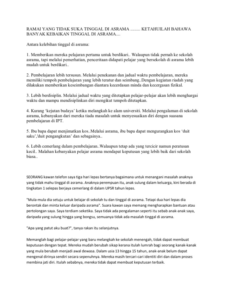 Anda akan menjadi seorang pelajar yang lebih berdisiplin, mempunyai jati diri yang tinggi dan berjaya menyesuaikan diri hidup bermasyarakat. Remaja di usia ini sedang dalam proses mengenali diri sendiri. Sekiranya anda tinggal jauh dari kampus, anda mungkin perlu membayar petrol, membaiki kenderaan dan utiliti anda. Kehidupan di sekolah asrama memberi beberapa manfaat seperti yang berikut: Tapi apa daya ayah, orang yang telah. Ada pelajar yang tidak mendapat kaunseling dan bimbingan daripada ibubapa mereka kerana mereka berada di sekolah asrama. Jauh di utara semenanjung di maktab perguruan persekutuan pulau pinang (m4p) (6 disember 1993), baru 6 hari abah ayah meninggal dunia. Inilah kelebihan yang dimiliki oleh anak asrama. Kehidupan di sekolah asrama memberi beberapa manfaat seperti yang berikut: Sebelum ini saya sudah kongsikan tentang pengalaman saya tinggal di asrama. Jarang mati listrik (ini saya ga tahu kenapa) ga perlu nyapu depan kamar atau ngebersihin kamar mandi. Selain itu, ia menjimatkan masa ibu bapa. Jun 09, 2012 · kelebihan tinggal di asrama.